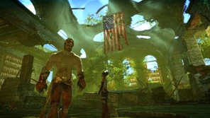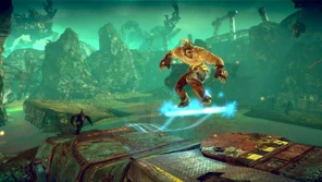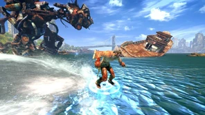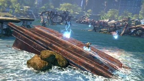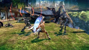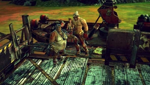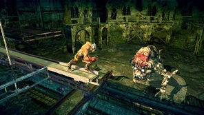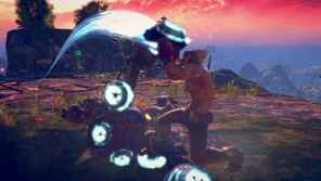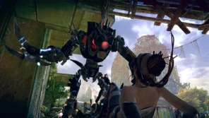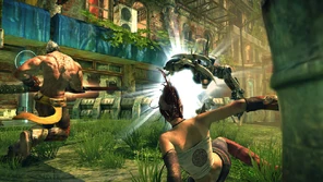 The main character in the game is called simply Monkey. He has spent his entire life fighting the machines and is your typical loner sort, a solitary man. Eventually Monkey is captured by the death machines, where he is placed on an airship. It is there that he meets a technologically adept woman named Trip. Ignoring Monkey's calls for assistance, Trip gets in the last escape pod and at the last minute, Monkey grabs onto it. The escape pod is launched, Monkey gets knocked unconscious when the escape pod crash lands. When he comes to, he finds a control band on his head that he cannot remove. Trip rewired the control band so that it would respond to her commands and if Monkey fights her commands it causes extreme pain and in the event of her death, his own as well. Trip needs him to help her get home and to ensure his cooperation, she resorts to this control band, which will crush his skull if he doesn’t follow her orders. As they try to make their way back to Trip's home village they must fight robots that have been laying dormant for years. The two of them have a strained relationship but in order to survive this perilous world they are going to need each other's help.